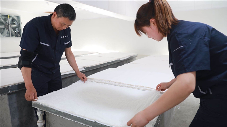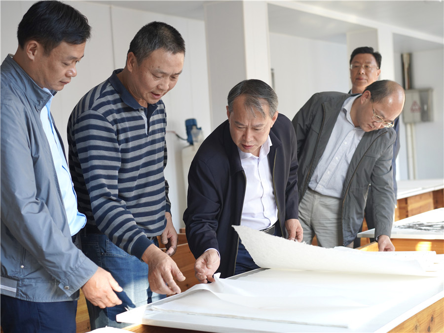 10月9日下午,縣長吳云忠赴海陽鎮(zhèn)凝霜文化發(fā)展公司調研徽州楮皮紙傳承與發(fā)展工作,縣委常委、海陽鎮(zhèn)黨委書記金學年,縣委常委、縣政府副縣長程衛(wèi)華參加調研活動。 吳云忠一行實地察看了徽州楮皮紙生產(chǎn)工藝流程,認真聽取企業(yè)負責人介紹,詳細詢問徽州楮皮紙制作工藝
